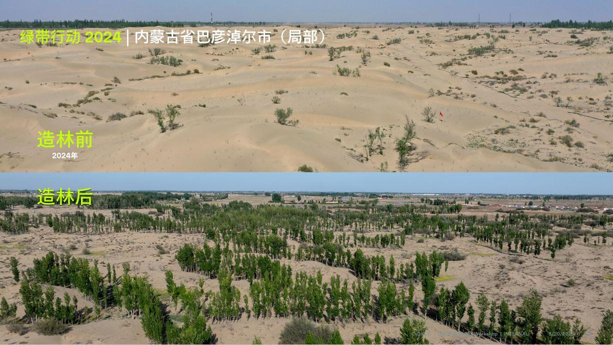 项目计划在2021至2030年间,在中国北部和西北部的10个生态脆弱地区种植850万棵适生树种,实现4,000万平方米的造林和生态修复面积,助力区域应对荒漠化、沙尘暴、水土流失、生物多样性缺失等严峻的环境挑战。通过这一长期项目,我们不仅助力修复当地生态环境和改善居民的生活条件,更为当地社区带来可持续发展的机遇,支持当地经济发展与乡村振兴,让绿色成为人与自然和谐共生的纽带。
