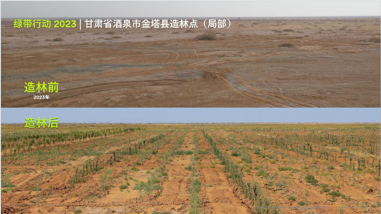 2023年,“绿带行动”在甘肃省酒泉市金塔县重点风沙口防治点开展造林项目。该风沙口位于中国八大沙漠之一的巴丹吉林沙漠的边缘,是酒泉地区75%的沙尘暴的策源地及强化区,长期影响当地居民的人居环境,遏制地区的经济发展。项目在当地完成种植85万棵梭梭、白刺、胡杨和沙枣,实现400万平方米造林和荒漠化防治面积,有效助力当地开展定点治理工程,保护周边耕地及境内黑河流域生态免受沙化侵扰,使12万当地居民及2万名黑河下游居民直接受益,间接惠及130多万长期受风沙影响的酒泉和嘉峪关居民。项目造林期间,为当地创造4800造林工日,为参与造林的低收入群众增收72万元。