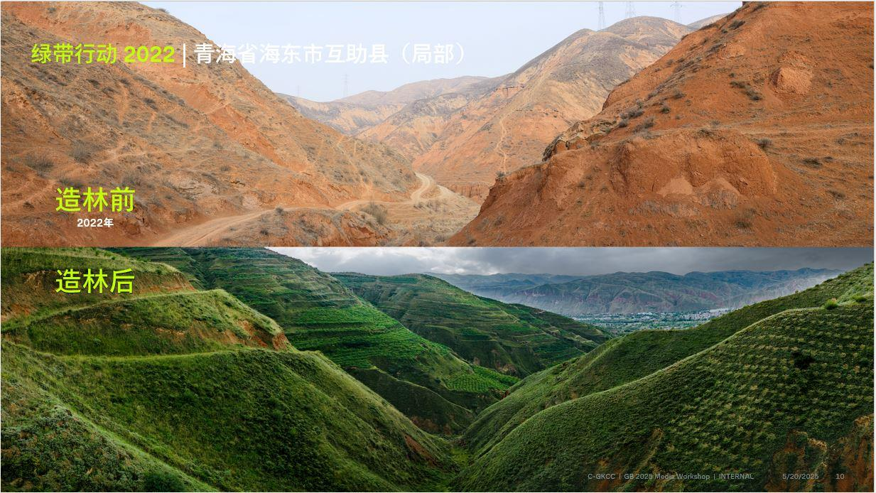 2022年,“绿带行动”在青海省海东市互助土族自治县塘川镇开展造林项目,共种植约85万棵青海云杉、油松和柠条,生态修复400万平方米严重水土流失的荒山。项目显著改善了当地生态环境,减少了荒山的风沙对当地村民的影响,为当地经济、民生的可持续发展营造更友好的生态环境,直接惠及超过4万名村民。项目造林期间,为当地创造了23370造林工日,为参与造林的低收入群众增收350万元,创造苗木收入达952万元。此外,项目还通过捐赠专业设备和提供森林管理类培训,赋能林业巡护员,以此推动当地林业建设。
